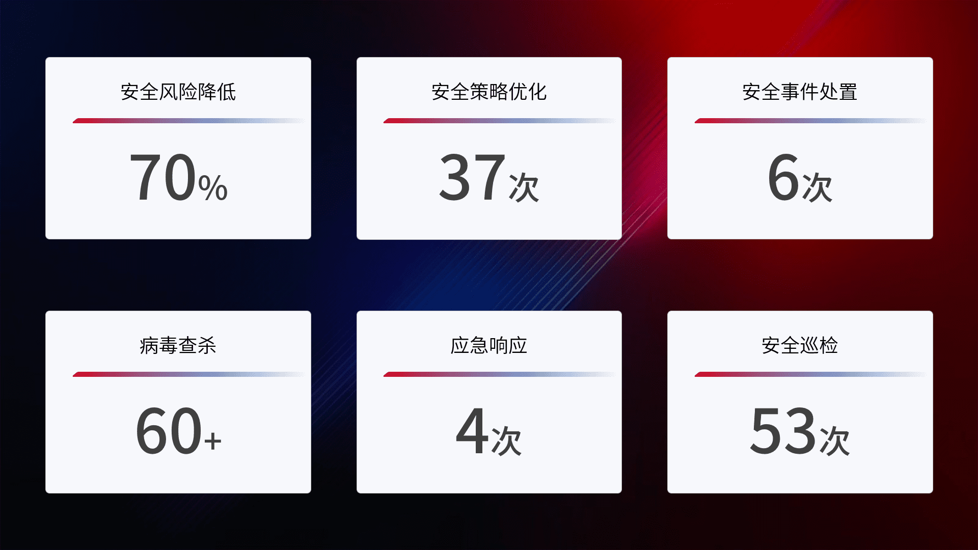 提供全面的安全事件报告体系,,,包括处置报告、、周报、、、、季度和年度总结,,,,结合持续监控,,,,帮助客户深入了解网络安全状况。。。