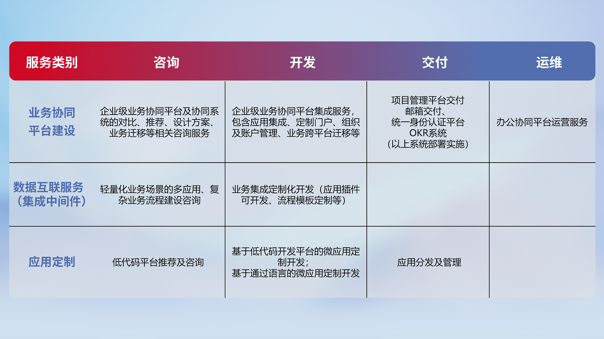 针对钉钉、、、、企微、、IDaas等平台级产品提供产品的规划、、、、方案、、、、交付、、、、定制化开发等服务,,,,实现如统一协同办公、、智能客户服务、、混合会议管理、、、智能数据查询、、、等业务场景,,,实现数字化转型。。。